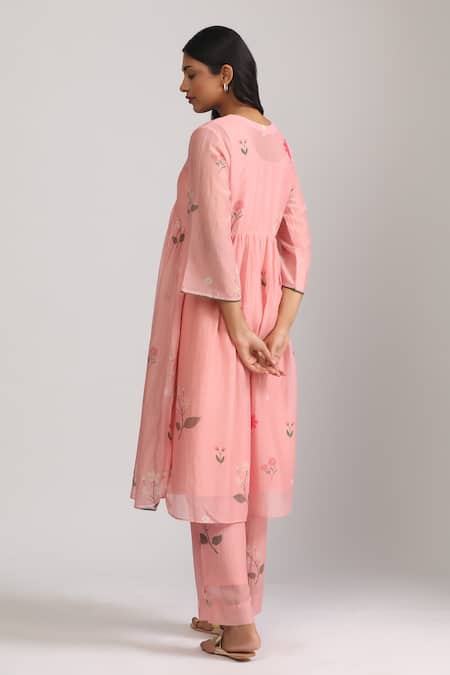 Pink A-line kurta featuring floral print with sequin and thread embroidery on the neckline. Paired with a straight cut pant with an elasticated waistband.