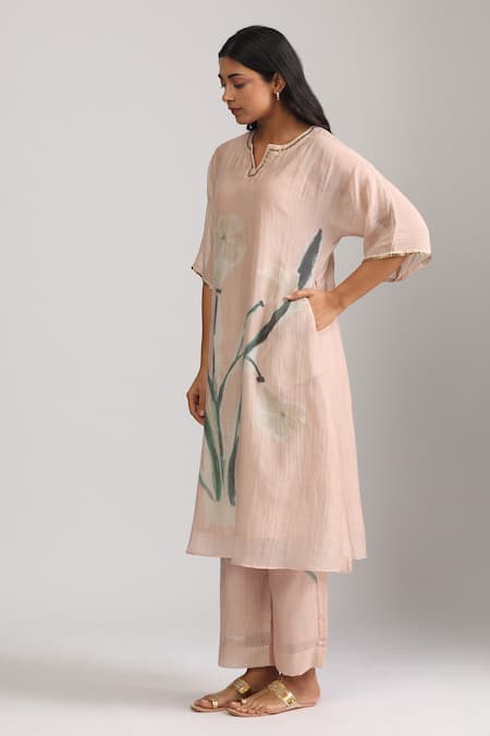 Peach Silk, Chanderi Embroidery Floral Kurta And Pant Set