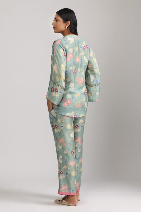 Mint green top featuring floral print with sequin and thread embroidery. Paired with matching pant featuring an elasticated waistband.