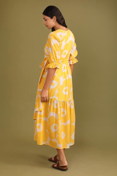 Yellow cotton wrap dress featuring a floral print with a tiered border and side tie-up