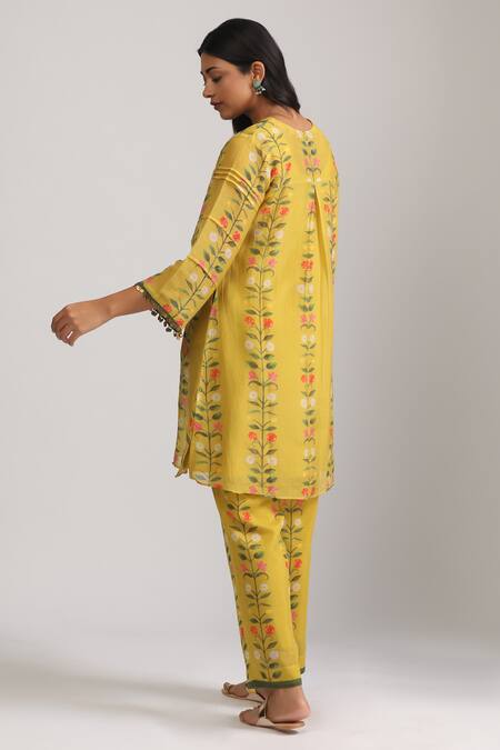 Mustard yellow kurta featuring floral stripe print, sequin, and thread embroidered sleeve hemline. Paired with straight cut pant with an elasticated waistband and side pockets.