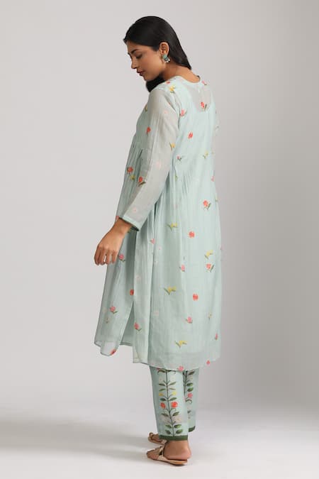 Ice blue kurta featuring florence print and sequin, thread embroidered neckline. Paired with inner and matching straight cut pant with floral details.