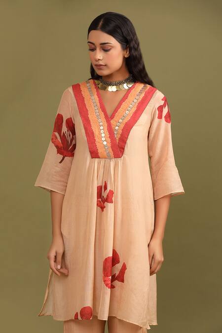 Beige silk chanderi gathered kurta featuring a V neck and three quarter sleeves. Paired with a printed straight fit pant and inner slip, adorned with contrast red gulmohar print and bead & sequin work.