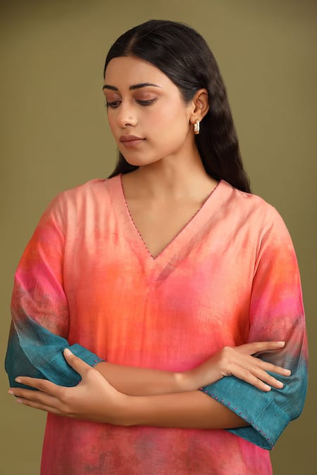 Multi color silk chanderi A-line kurta featuring ombre haze print and French knot embroidered V neck. Paired with straight fit pant and inner slip with attached lining.