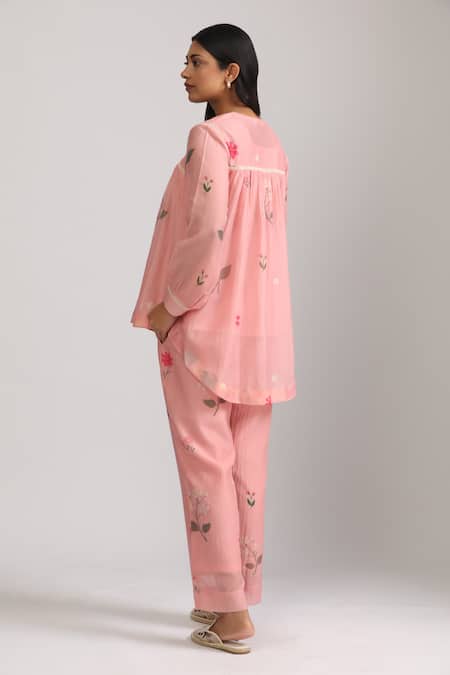 Pink peplum top featuring vertical floral print and lace embellished panel. Paired with straight cut pants with an elasticated waistband and side pockets.