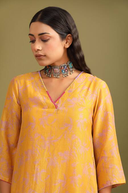 Yellow silk chanderi kurta featuring a V neck, three-quarter sleeves, and high-low hem. Paired with printed straight fit pant and an inner slip.