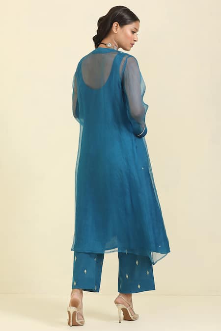 Buy_Trendy Tokari_Blue Organza Mirrors Open , Round Border Embroidered Jacket Pant Set _at_Aza_Fashions