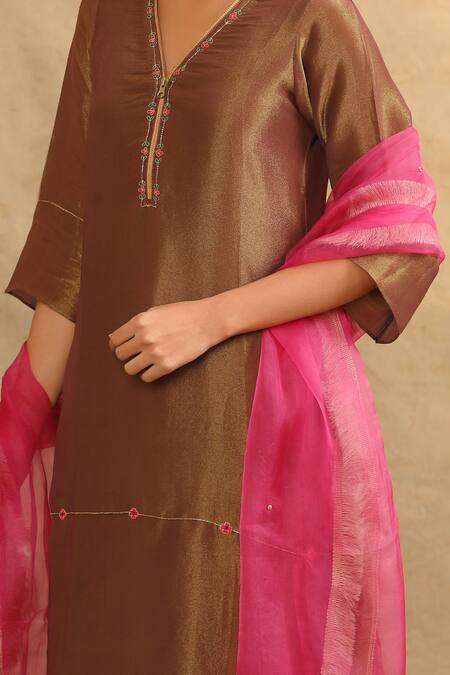 Brown Silk, Polyester, Chanderi Embroidery V-neck Placement Kurta Pant Set