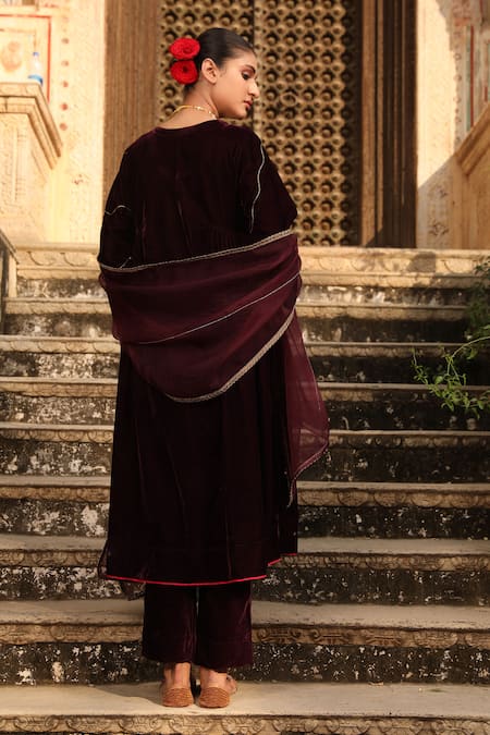 Purple velvet kurta featuring floral embroidery with dabka, sequin, and zari work. Paired with matching pant and a border embroidered sheer dupatta.
