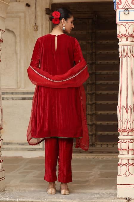 Red velvet kurta featuring French knots and pitta embroidery in bloom pattern. Paired with matching pant and dupatta.