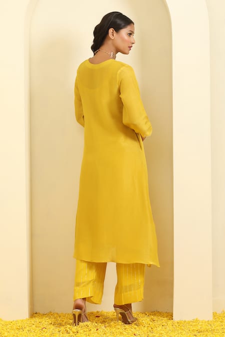 Yellow Silk, Tissue Embroidery, Zari, Tassels V-neck Sheesha Kurta Pant Set
