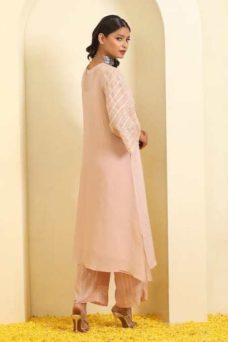 Buy_Trendy Tokari_Peach Silk, Tissue Gota Patti, Sequins, Striped Lace Embroidered Kurta Pant Set _Online_at_Aza_Fashions