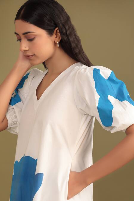 Contrast blue tulip print on the dress, Puff sleeves for added volume, Side pockets for functionality