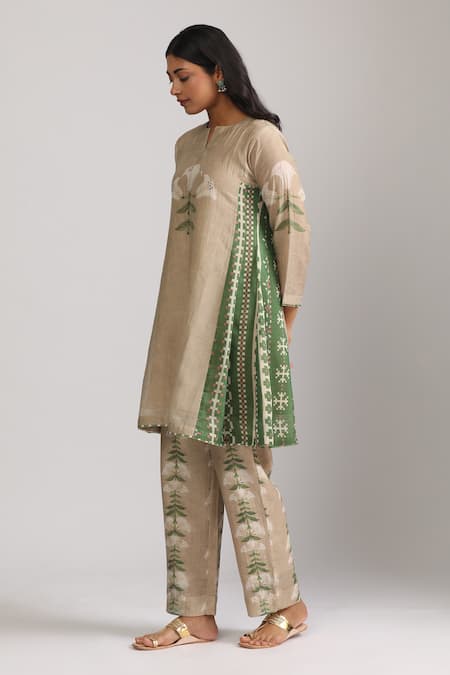Beige Silk, Chanderi Embroidery Button-down Neck Tulip Print Kurta And Pant Set