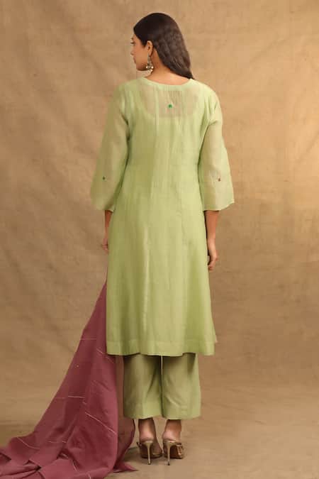 Green kurta featuring resham and zari embroidery throughout. Paired with matching pant and silk chanderi dupatta.