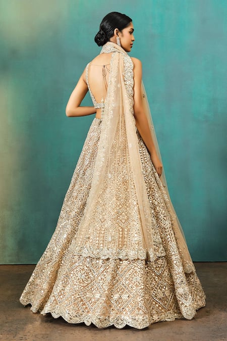 Buy_Aneesh Agarwaal_Beige Net, Silk Mirrors, Diamonds, Triangle Applique Work Bridal Lehenga Set _Online_at_Aza_Fashions