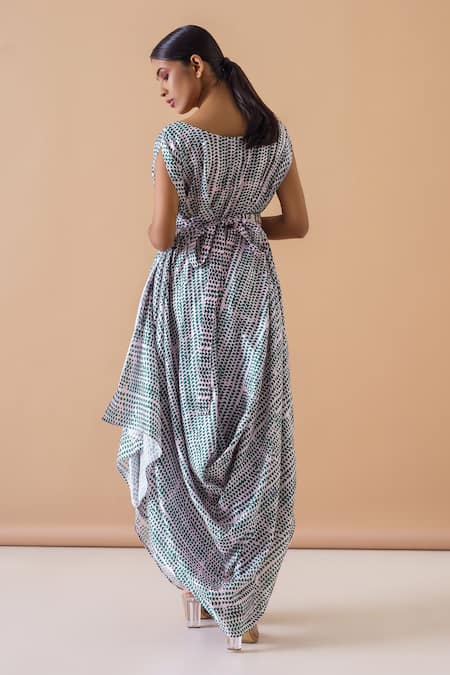 17:17 By Simmi Saboo_Peach Muslin Silk Triangle Boat Neck Print Cowl Gown_Online_at_Aza_Fashions