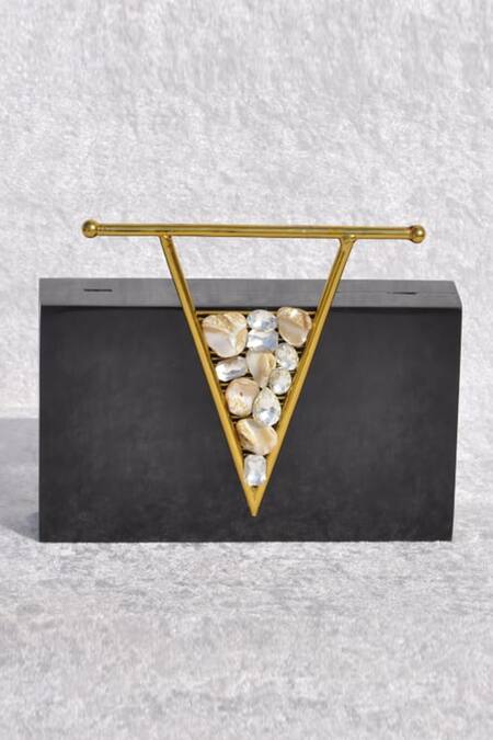 Black rectangular clutch featuring stone embellishments in a triangle pattern