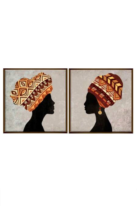 Multicolor square-shaped set of 2 handmade paintings with tribal women in canvas base.