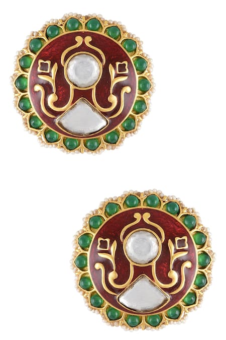 Gold embellished stud earrings featuring pearls, crystals, and colored glass