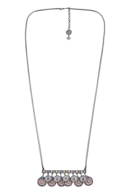 Oxidized silver plated necklace featuring floral motifs and coin droplets on a bar
