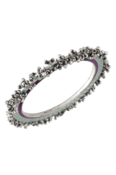 Oxidised silver bangle featuring multicolor enamel work with rawa work and ghunrgoo drops