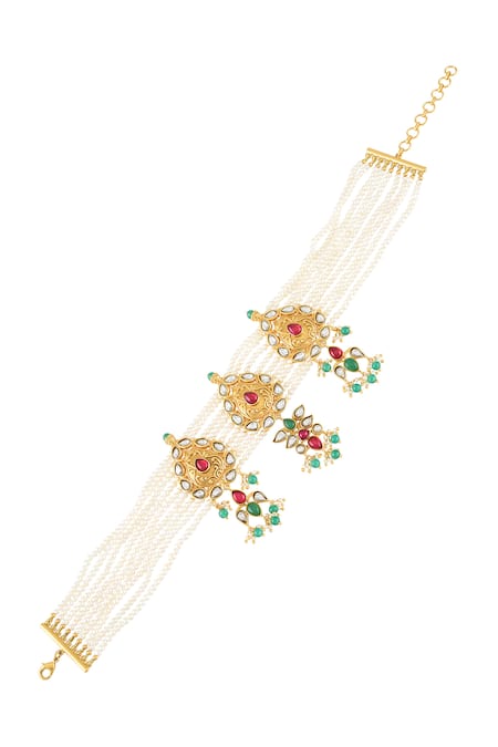 Gold choker featuring pink and green stone studded drop carved pendants with pearl multi strands