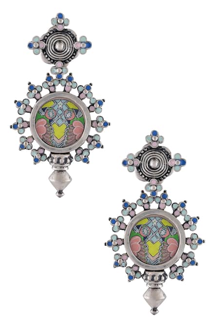 Silver Plated Embroidery Hand Painted Enamel Coin Earrings