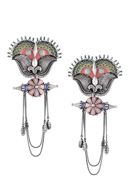 Oxidised silver plated earrings featuring carved details and floral motifs