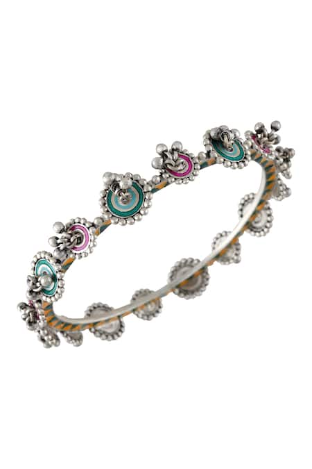 Multi color oxidised silver bangle featuring enamel work, rawa detailing, and ghungroo drops