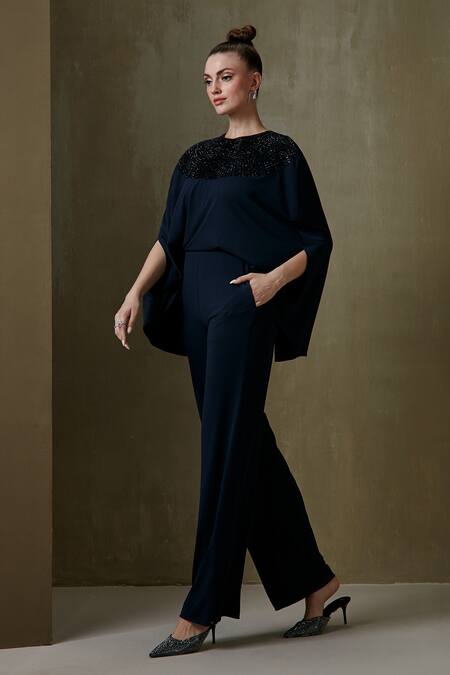 Navy blue cape style jumpsuit with contrast embellishment on the neckline.