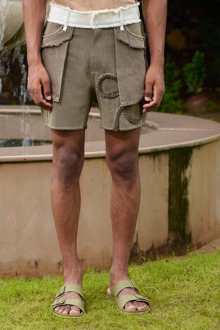 Brown shorts featuring macrame patchwork and a relaxed fit. Detailed with a white waistband and distress hem.