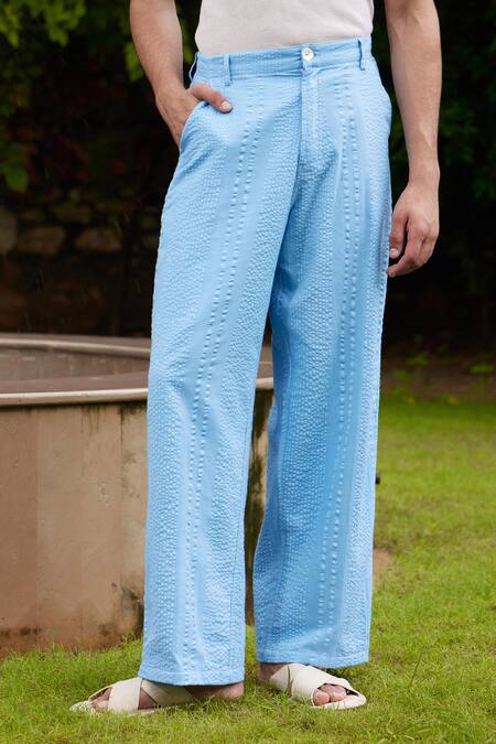 Blue pant featuring a tonal stripe pattern and a relaxed fit