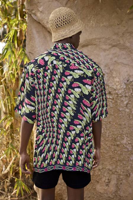 Black button down shirt featuring dragon fruit distortion print and half sleeves