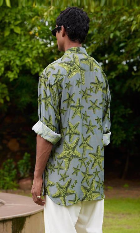 Green shirt featuring all-over star fish patterns and a hidden placket