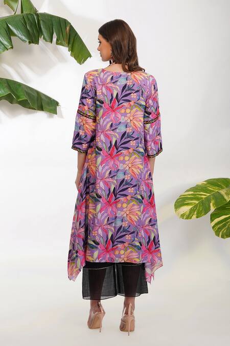 Purple Viscose Cotton Silk Printed Flower Motifs V Tropical Tunic And Pant Set