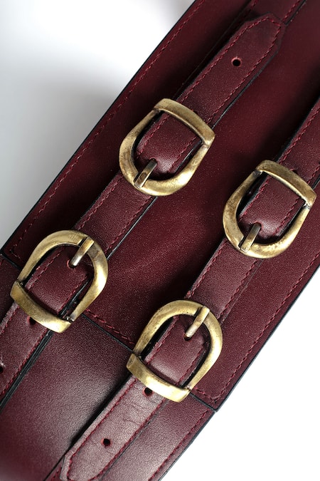 Burgundy broad leather belt featuring double buckle and loop detail