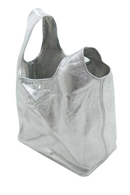 Silver distressed metallic leather wristlet bag featuring a unique design with a longer handle that loops through a shorter handle