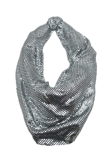 Silver handbag featuring a knotted top design with chain mail detailing