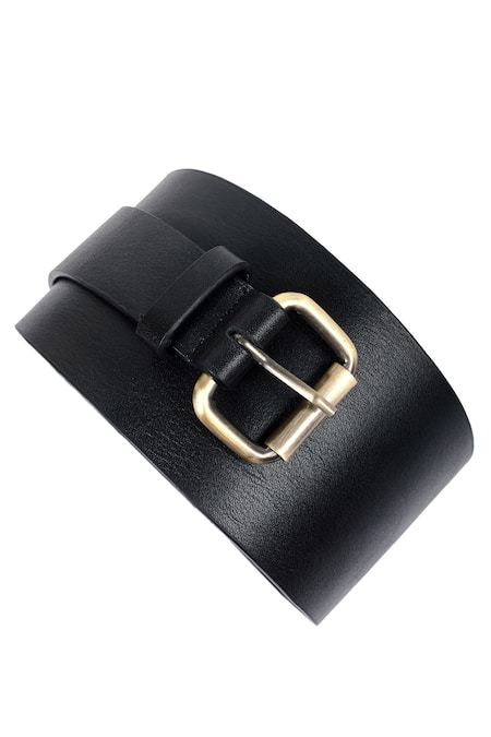 Black broad belt made from leather, featuring a frame buckle closure
