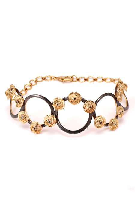 Gold plated oyster charm detailing, Black circular ornamentation, Lobster lock closure