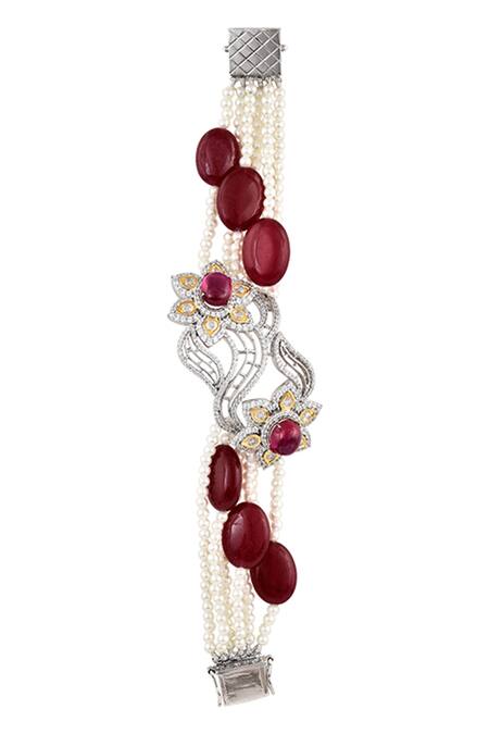 Zircon crystal center with floral design, Layered pearl strands with hydro rubies, Clasp closure for secure fit