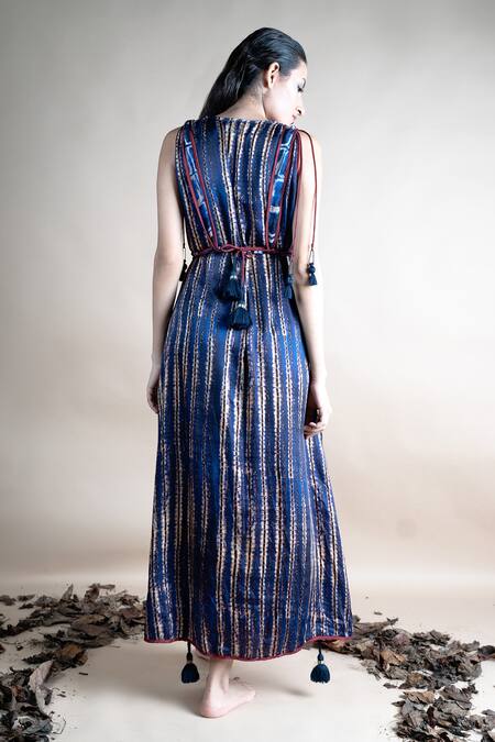 Blue maxi dress with all-over stripe pattern, square pattern on the cowl neckline and contrast trim on the hem. Comes with cross body belt.