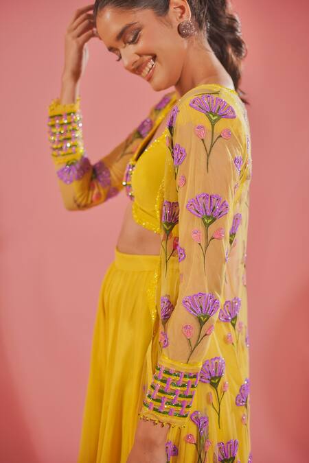 Yellow floral cutdana embroidered jacket featuring full sleeves and an open neck. Paired with a padded blouse and a flared sharara with attached cancan.