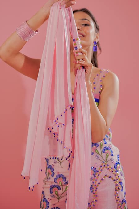 Pink kurta featuring a sweetheart neckline, embroidered floral patterns with cutdana and resham work. Paired with matching pant and a choker dupatta with a detachable buckle.
