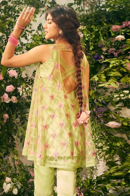Green jacket featuring floral resham embroidery with bead embellishments. Paired with a padded tunic and straight pant, this set includes sheer detailing and back criss cross detailing.