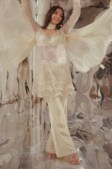 Off-white layered kurta featuring patchwork and zari embroidery in a petal pattern. Paired with an embroidered straight pant and a dupatta.