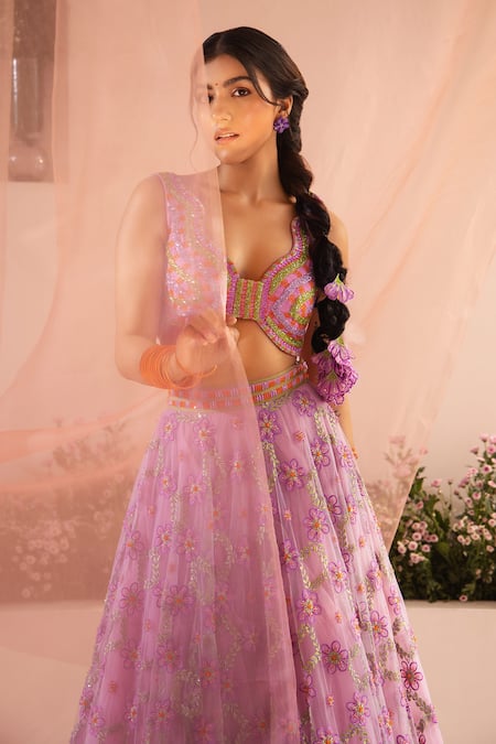 Purple lehenga featuring all-over periwinkle garden embroidery with orange-green resham thread, embellished with glass beads and stones. Paired with a structured V neckline raw silk padded blouse and a tulle dupatta with embellished borders.