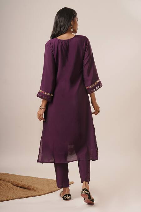 Buy_Tuli_Purple Viscose, Silk, Chiffon Embroidery, Tassels Round Neck Kurta Pant Set_Online_at_Aza_Fashions