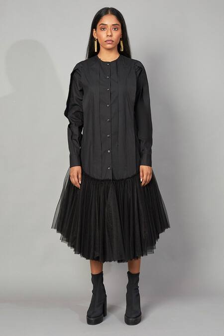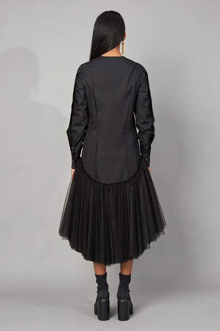 Black shirt-style dress with front button placket and tulle ruffle detailing.